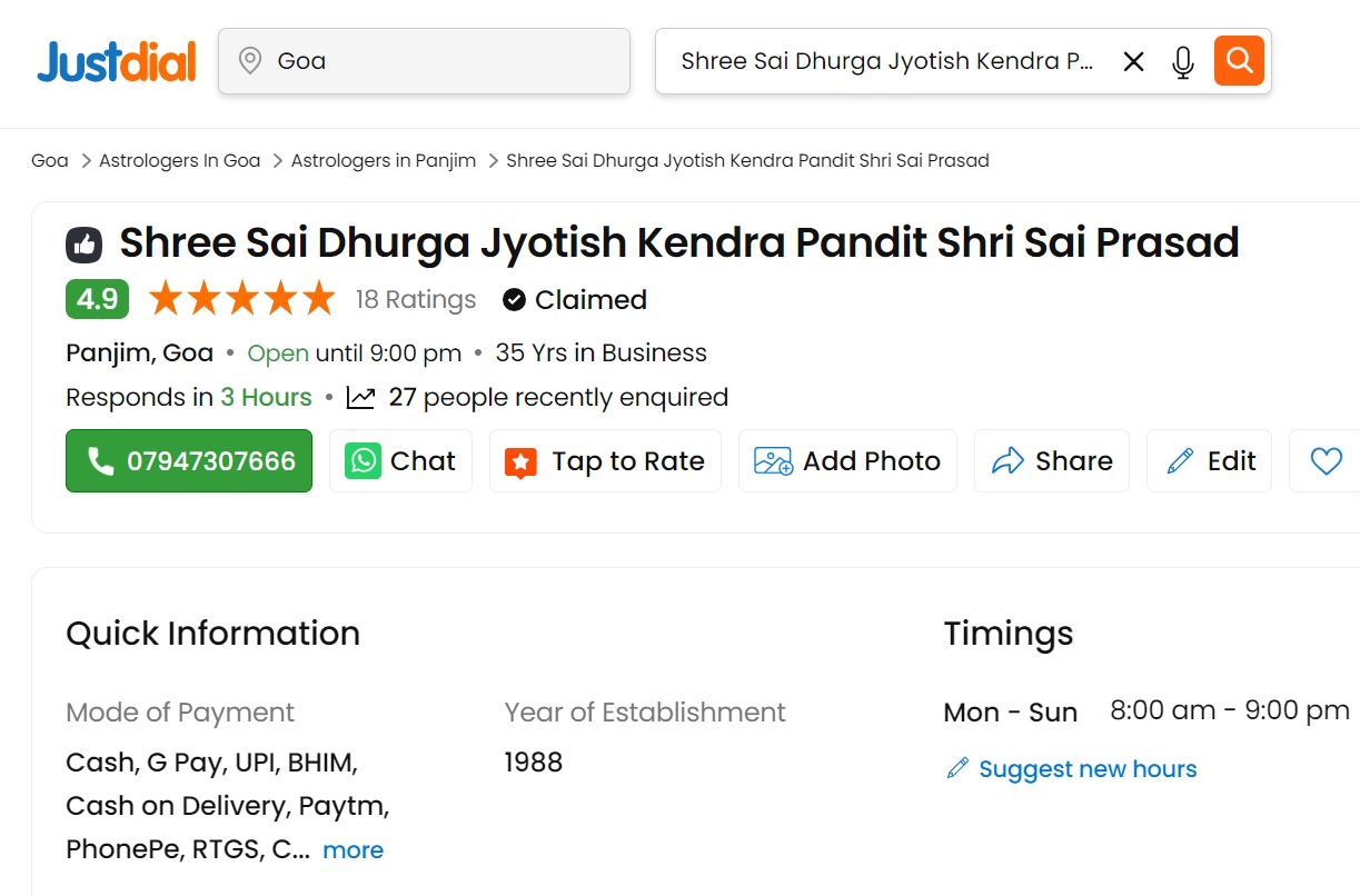 Pandit Shri Sai Prasad offers exceptional astrology services in Goa. He believes that astrology is a divine gift that enables us to glimpse into our future. With the vision of sharing this precious gift with everyone, Pandit Shri Sai Prasad established “Pandit Shri Sai Prasad” a dedicated astrology service center. Here, people can access the profound wisdom of astrology and benefit from his insightful guidance and predictions.